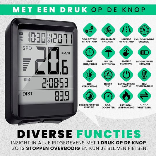 Strex Kabelloser Fahrradcomputer - 17 Funktionen - Extra großer Bildschirm - Kabelloser Fahrradcomputer Kabellos und wasserdicht - NL Manual