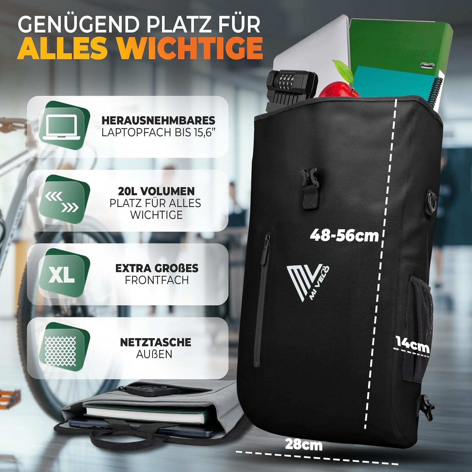 MIVELO - 3-in-1 wasserdichte Fahrradtasche - Rucksack und Umhängetasche - inkl. Laptopfach - 20L - Schwarz