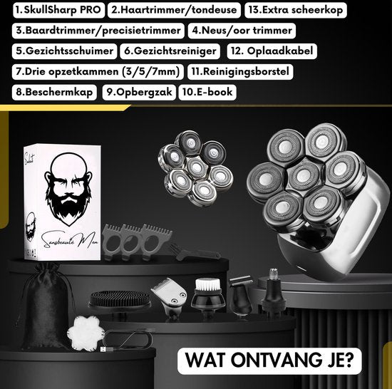 Sansbeauté® - SkullSharp PRO – 6-in-1 Herrenrasierer für Gesicht & Kopf – Kabellos, Nass/Trocken, inkl. Extra-Scherkopf & Aufsätze