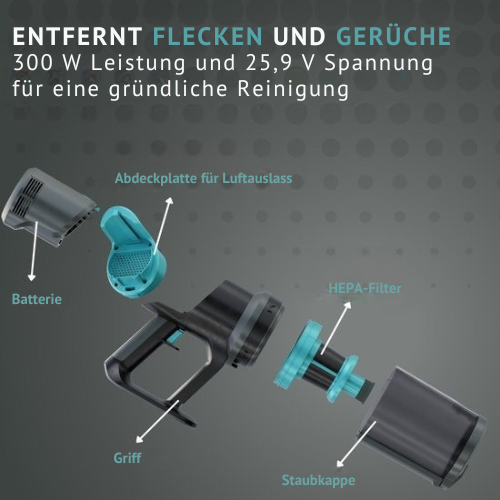 Mit einer Leistung von 300 W und einer Spannung von 25,9 V liefert dieser Stabstaubsauger die Leistung, die Sie für eine gründliche Reinigung benötigen, ohne lästige Kabel. Mit einem Gewicht von nur 2,5 kg ist dieser Stielstaubsauger leicht und einfach zu handhaben, selbst bei längeren Reinigungsarbeiten.