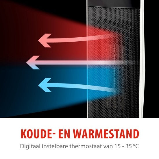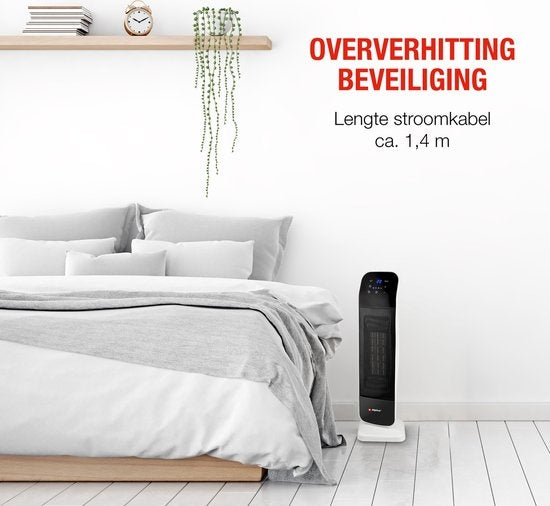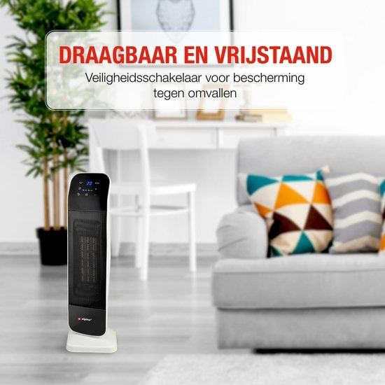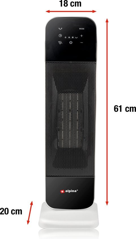 Sie möchten zusätzliche Wärme in Ihr Zuhause bringen? Dieser Keramik-Heizlüfter von Alpina sorgt für elektrische Wärme. Ideal, wenn Sie in einem Raum keine Zentralheizung haben oder wenn es Ihnen trotz Zentralheizung zu kalt wird. Alles, was Sie für diesen Heizlüfter brauchen, ist eine Steckdose in der Nähe und eine ebene Fläche. Also ideal z. B. auf einem unbeheizten Dachboden oder in einem Schuppen. Sie können das Gerät auch lüften lassen, ohne dass es Wärme abgibt, es kühlt also wie ein Ventilator. Kurzum, zwei Fliegen mit einer Klappe: Heizen im Winter und Kühlen im Sommer! Drei Modi: Heizen oder Kühlen Der Heizlüfter hat 3 Modi: Nur Lüften, ohne Heizen Leistungsstufe 1: 1300 Watt Leistungsstufe 2: 2000 Watt In der ersten Einstellung verteilt das Gerät nur Luft und arbeitet somit als Ventilator, der an heißen Tagen für Kühlung sorgt. In den Stufen 2 und 3 wird geheizt, wobei Sie die Temperatur zwischen 15 und 35 Grad Celsius einstellen können. Keramikheizung Dieser Heizlüfter verfügt über ein Keramikelement, das Strahlungswärme abgibt. Keramikheizungen sind relativ energieeffizient und auch sicherer als Heizungen, die auf andere Weise heizen. Das liegt daran, dass ein Keramikelement viel weniger heiß wird, während der Ofen immer noch effizient Wärme abgibt und einen Raum schnell und gleichmäßig aufheizt. Diese niedrigere Temperatur sorgt auch dafür, dass Sie keinen Verbrennungsgeruch wahrnehmen und der Ofen die Luftqualität in Ihrer Wohnung nicht beeinträchtigt. Das ist sehr angenehm für Menschen mit empfindlichen Atemwegen. Mit Fernbedienung Der schwarz-weiße Kaminofen ist ein kompaktes Turmmodell mit einer Höhe von 61 Zentimetern. Die Steuerung erfolgt über das LCD-Display auf der Oberseite oder über die mitgelieferte Fernbedienung. So können Sie ihn bequem von Ihrem Sessel oder Ihrem Bett aus einschalten. BITTE BEACHTEN SIE: Im Lieferumfang der Fernbedienung ist KEINE Batterie enthalten (1x CR2025). Zeitschaltuhr, Pendelfunktion und Griff Der Heizlüfter verfügt über eine Zeitschaltuhr, mit der Sie ihn nach 1 bis maximal 12 Stunden automatisch ausschalten können. Außerdem kann der Heizlüfter oszillieren. Dann schwingt er automatisch in einem Winkel von etwa 90 Grad hin und her. Auf diese Weise verteilt er die Luft noch besser im Raum. Dank des integrierten Griffs an der Rückseite lässt er sich ganz einfach bewegen. Ideal, wenn Sie den Standofen beispielsweise tagsüber im Wohnzimmer und nachts im Schlafzimmer verwenden möchten. Außerdem ist dieser Ofen mit einem Kippschutz und einem Überhitzungsschutz ausgestattet. Details alpina Keramik-Heizlüfter Eingangsleistung: 2000 Watt Modell: KPT-2402D Mit Zeitschaltuhr (verzögerte Abschaltung 1 bis 12 Stunden) und Griff Schwenkbar (Oszillation): ca. 90 Grad 3 Stufen Temperaturbereich: 15 und 35°C Batterie-Fernbedienung: CR2025 Geschützt mit Umkippschalter und gegen Überhitzung Stromversorgung: 220-240 V?50-60 Hz Schutzklasse: II Nettogewicht: Ca. 1,5 kg Abmessungen: 20 x 18 x 61 cm