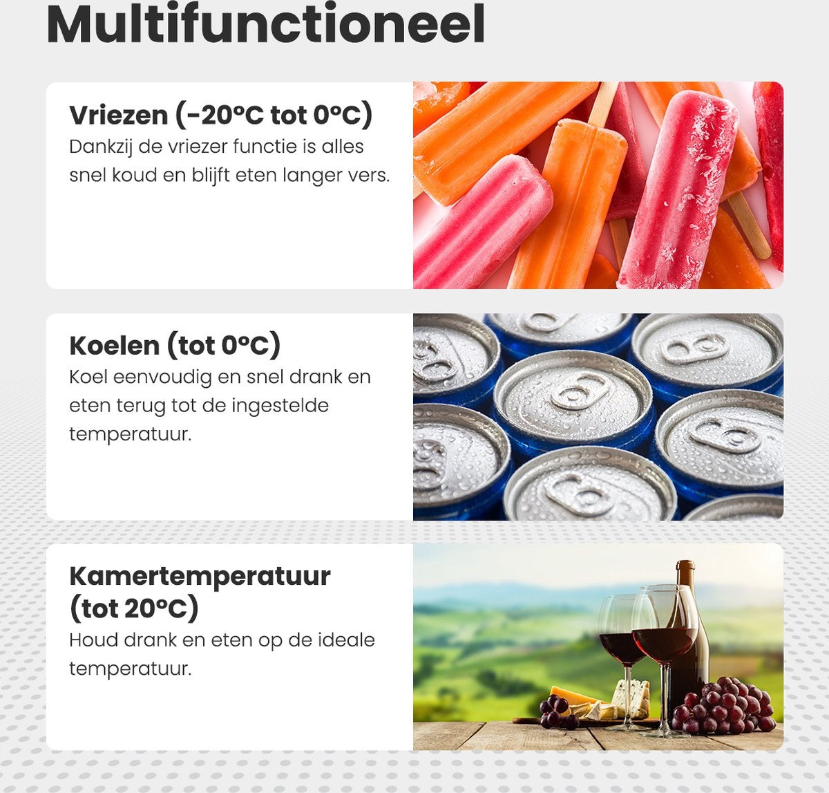 Die elektrische Kühlbox verfügt über verschiedene Positionen, wie eine Max-Position für zusätzliche Kühlung und eine Eco-Position für weniger Energieverbrauch. Das gibt Ihnen mehr Flexibilität und macht es einfacher, die Kühlbox an jede Situation anzupassen. Mit ihrem kompakten Design ist sie die perfekte Kühlbox für jede Gelegenheit. Es gibt viele Gründe, diese Kühlbox zu kaufen!