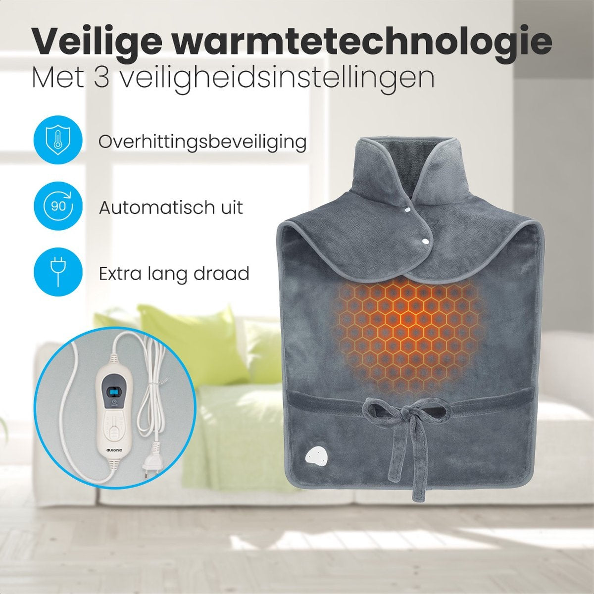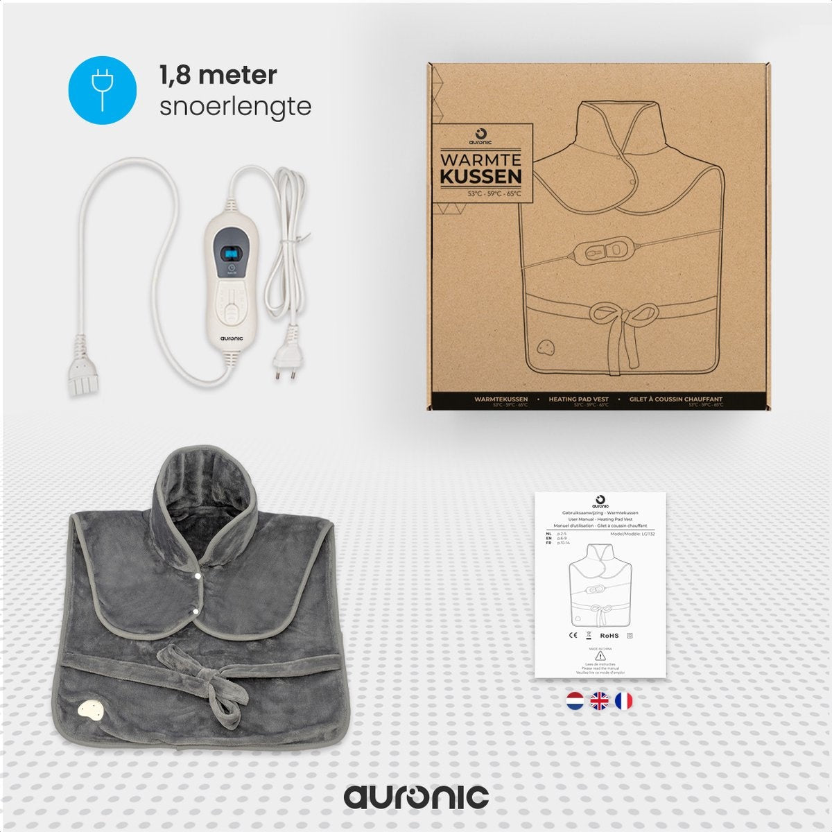Auronic - Heizkissen - 3 Wärmestufen - Überhitzungsschutz - Waschbar - Grau