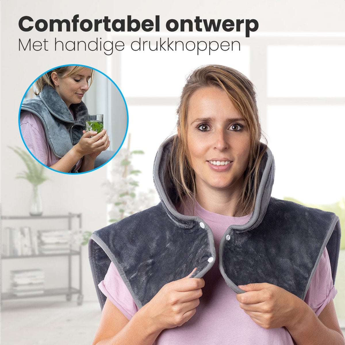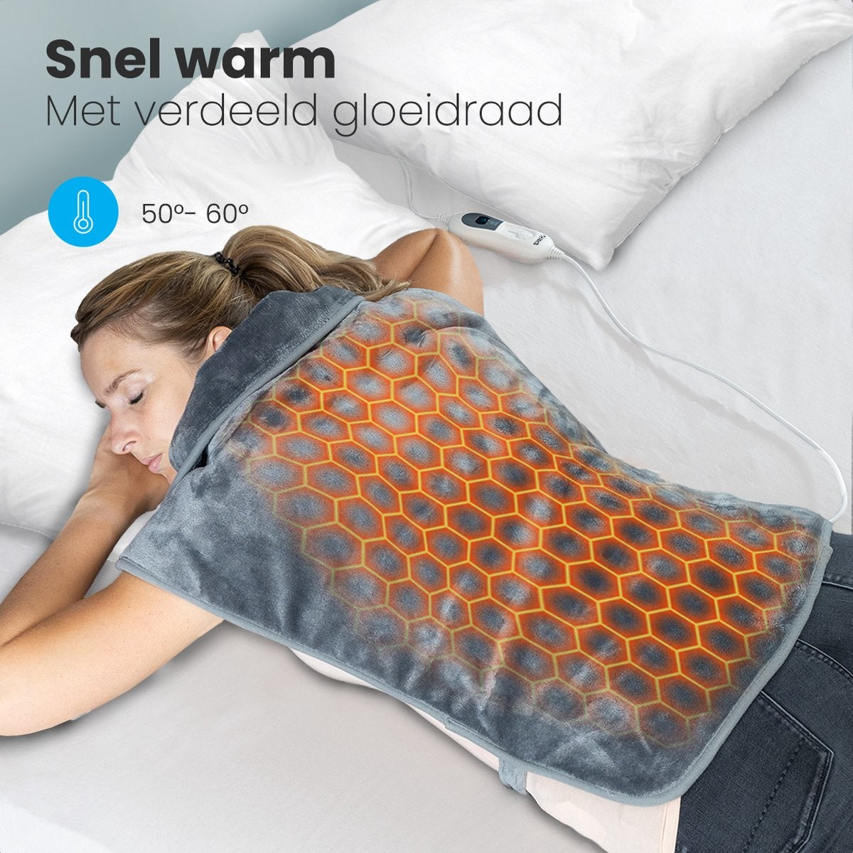Das Wärmekissen hat ein praktisches, benutzerfreundliches Design. Sichern Sie das Kissen mit den Druckknöpfen und der Kordel. Die beschwerten Kanten sorgen dafür, dass das Kissen an seinem Platz bleibt. So können Sie sich auch während der Benutzung frei bewegen! Verwenden Sie das Wärmekissen zum Beispiel beim Arbeiten, Lesen oder Lernen. Dank dem langen Kabel (2,35 m) können Sie sich sogar problemlos im Raum bewegen.