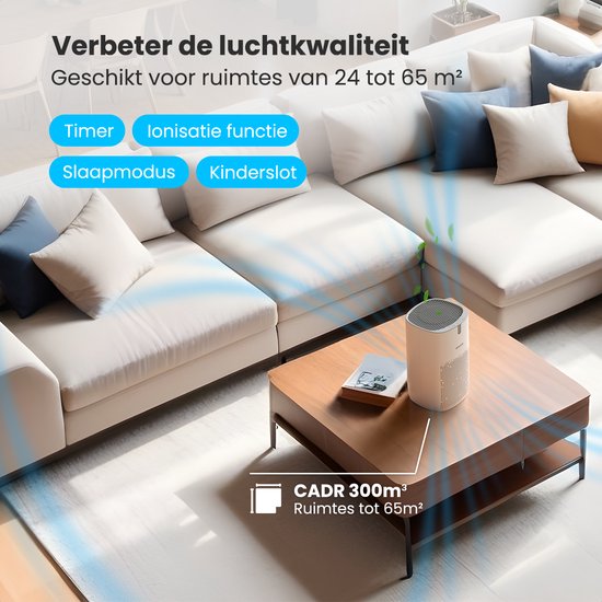 Mit einer CADR (Clean Air Delivery Rate) von 300m³ pro Stunde ist dieser Luftreiniger bestens für Räume bis zu 65m² geeignet. Damit eignet er sich perfekt für große Wohnräume, Büros und mehr, Schlafzimmer und sogar für Yoga-Räume. Die hohe Luftzirkulation sorgt dafür, dass die Luft schnell und effektiv gefiltert wird, so dass Sie immer frische und saubere Luft genießen können.