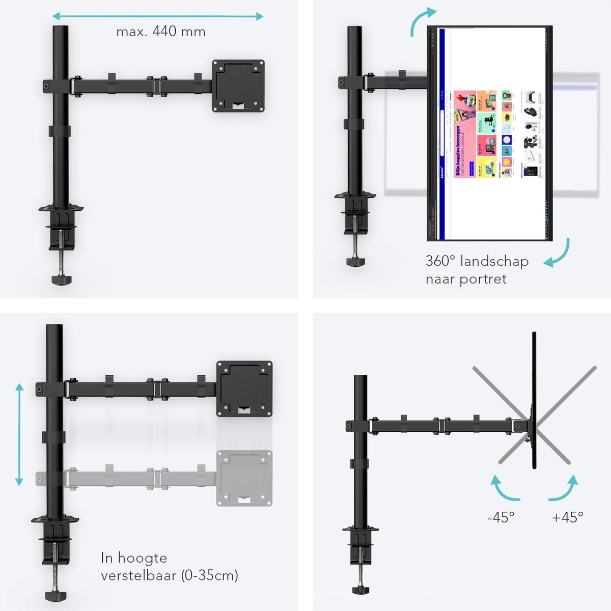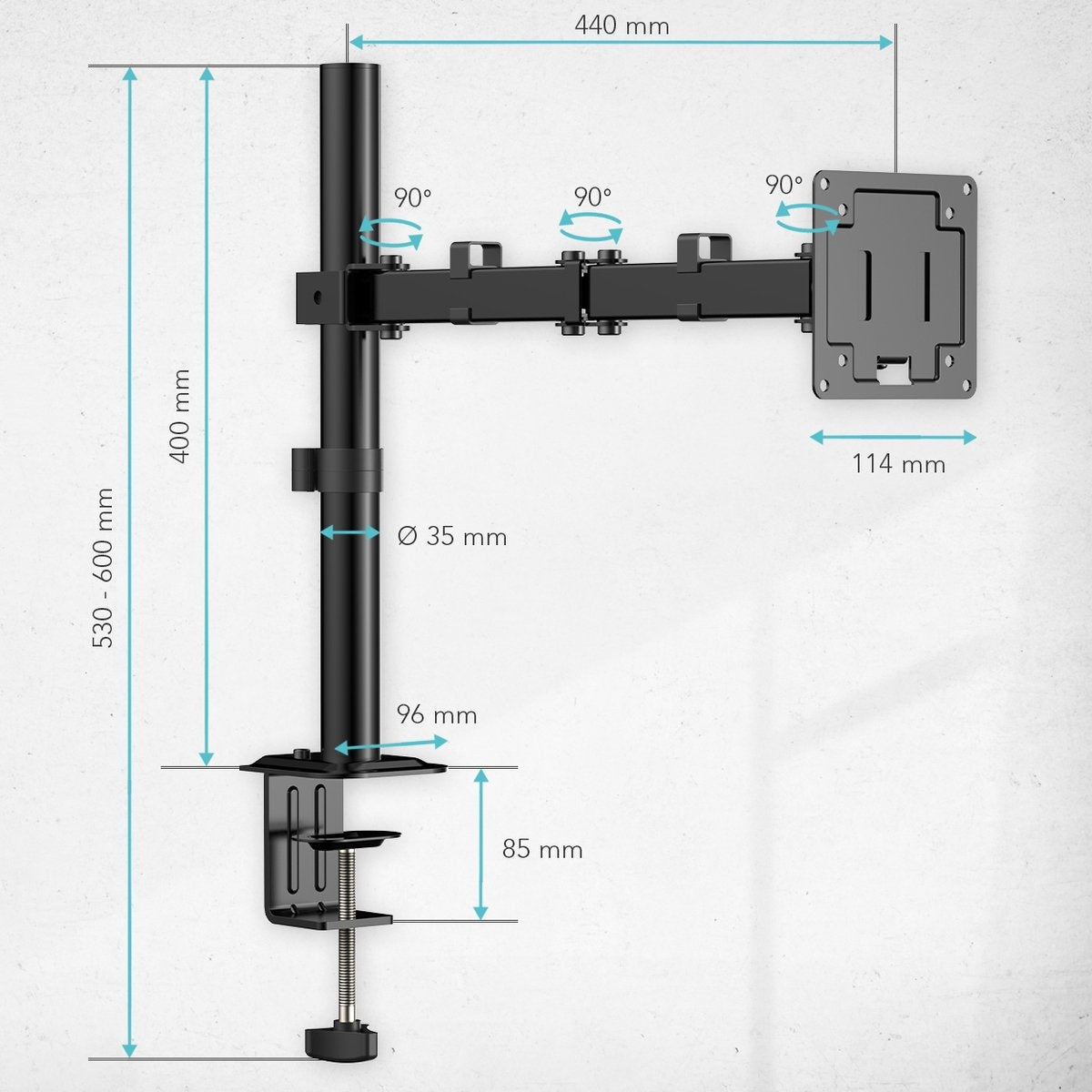 Das ergonomische Design erm?¶glicht es Ihnen, Ihren Bildschirm um 360? zu drehen, so dass Sie ihn sowohl im Quer- als auch im Hochformat verwenden k?¶nnen. Sie k?¶nnen den Bildschirm auch um 45? nach oben oder unten neigen. Au?Ÿerdem k?¶nnen Sie den Arm selbst um 90? drehen. Au?Ÿerdem ist der Fu?Ÿ auch in der H?¶he verstellbar, bis zu 350 mm. Der Arm ist aus starkem Stahl gefertigt und hat eine Tragkraft von 10 kg.