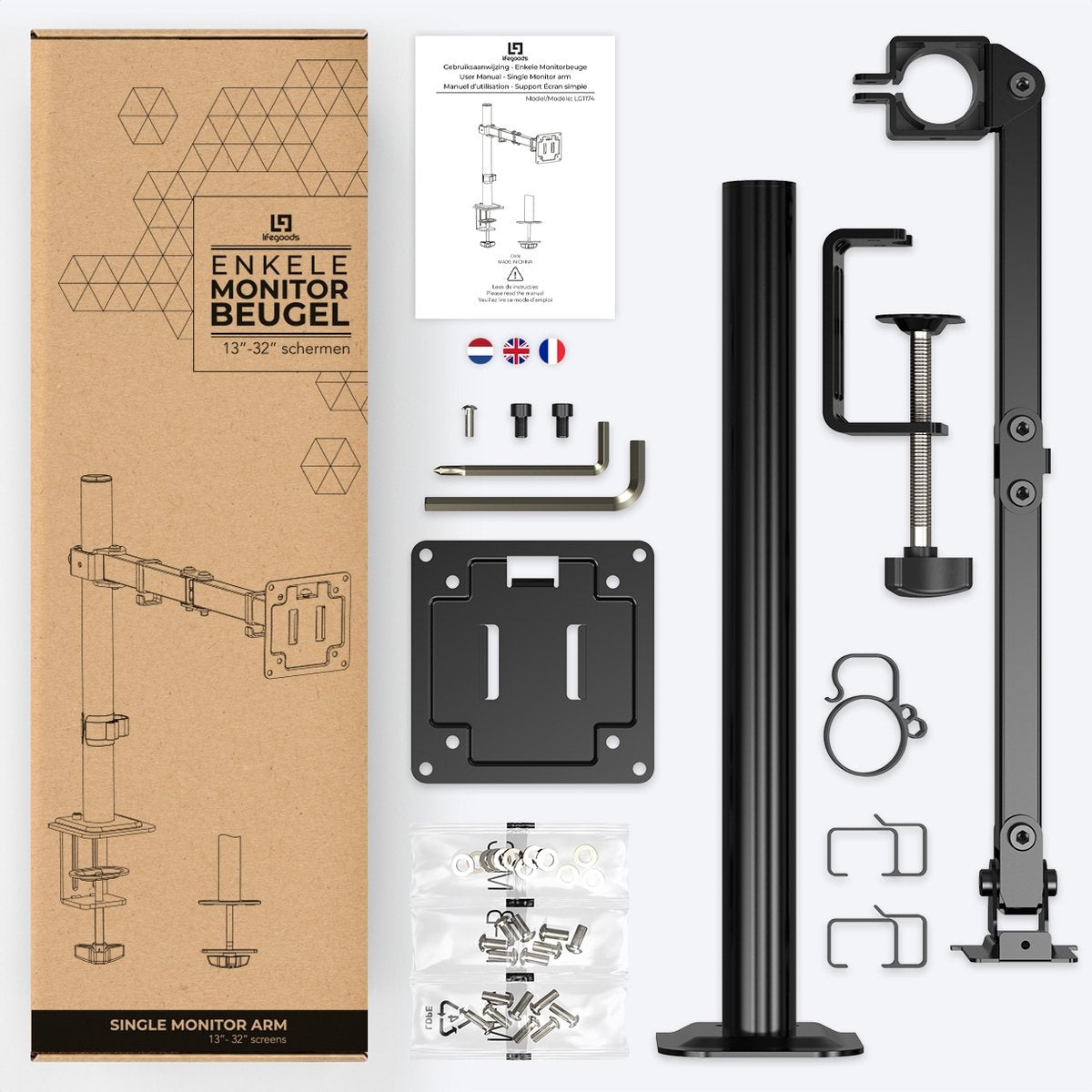 Die LifeGoods Einzelmonitorhalterung ist perfekt für Gamer, Designer, Programmierer und andere, die viel am Computer arbeiten. Der Monitorarm ist groß genug, um Bildschirme von 13 bis 32 Zoll zu halten. So behalten Sie mehr Platz auf Ihrem Schreibtisch und alles bleibt aufgeräumt und organisiert. Er kann neben Monitoren auch Flachbildschirme halten!