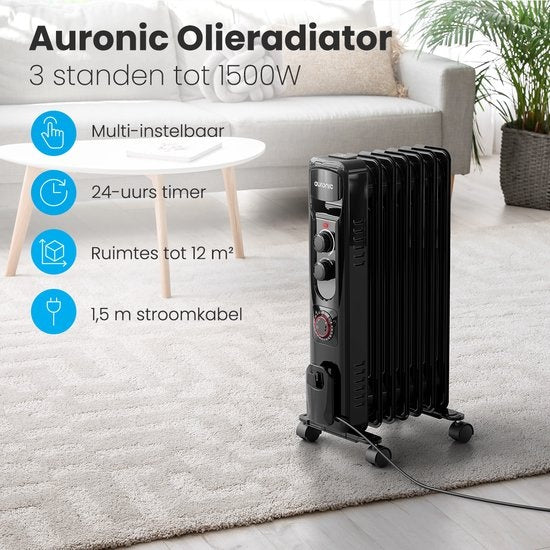 Auronic Ölradiator - Elektrische Heizung - Thermostat - Timer - 3 Stufen - bis zu 1500W - Schwarz