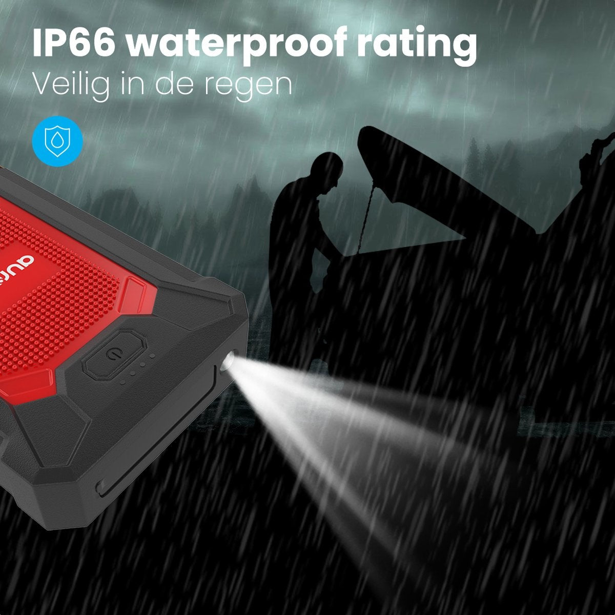 Der Jumpstarter ist wasser- und staubdicht. Selbst wenn er in starkem Regen steht, funktioniert die Powerbank einwandfrei. Dank des robusten Gehäuses hält die Powerbank auch harte Stöße aus.