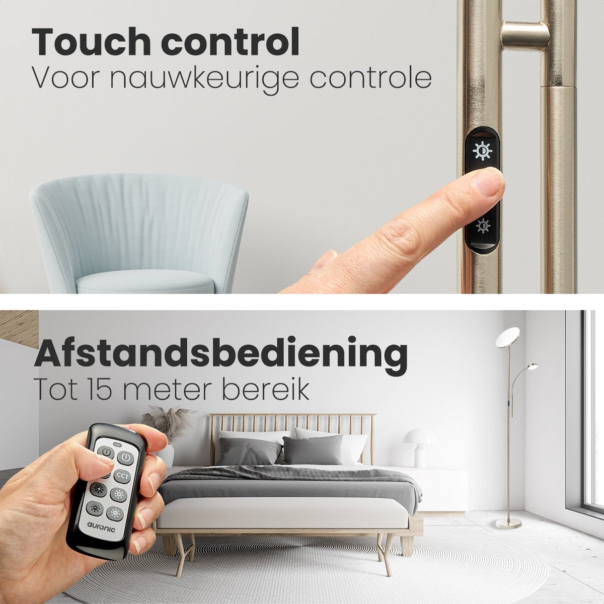 Suchen Sie nach einer vielseitigen und stimmungsvollen Leuchte für Ihr Zuhause oder Büro? Die Auronic Stehleuchte ist Leseleuchte und Stehleuchte in einem. Beide Lampen sind voll dimmbar und haben 3 verschiedene Farbtemperaturen und Stärken. Wählen Sie zwischen warmem Licht (3000K), natürlichem Licht (4000K) oder kalt-weißem Licht (6000K). Außerdem können Sie die Lampen nach Belieben in alle Richtungen schwenken. Steuern Sie die Lampen ganz einfach über das Touch-Panel an der Lampe selbst oder mit der Fernbedienung. Die Lampe ist robust und gut ausbalanciert.