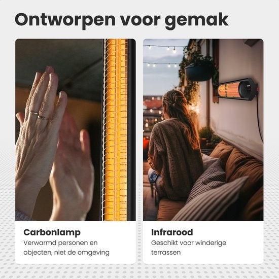 - Darüber hinaus verwendet der Auronic Terrassenheizer mittlere Infrarotstrahlung, so dass das Gerät selbst auf windigen Terrassen effektiv ist. Im Gegensatz zu herkömmlichen Terrassenheizern, die hauptsächlich die Umgebung erwärmen, zielt die mittlere Infrarotstrahlung auf Personen ab. So bleibst du unabhängig von den Wetterbedingungen schön warm. Das Gerät verfügt auch über eine Carbonlampe, die Personen und Objekte erwärmt, nicht die Umgebung. Das bedeutet, dass du sofort die Wärme genießen kannst, sobald du den Terrassenheizer einschaltest.