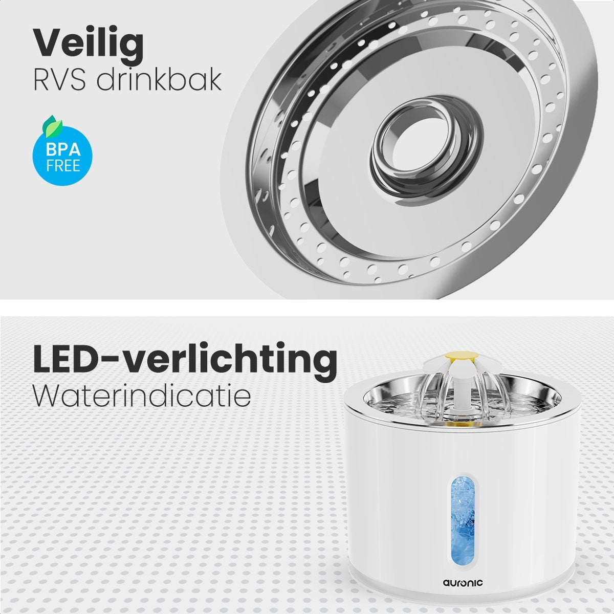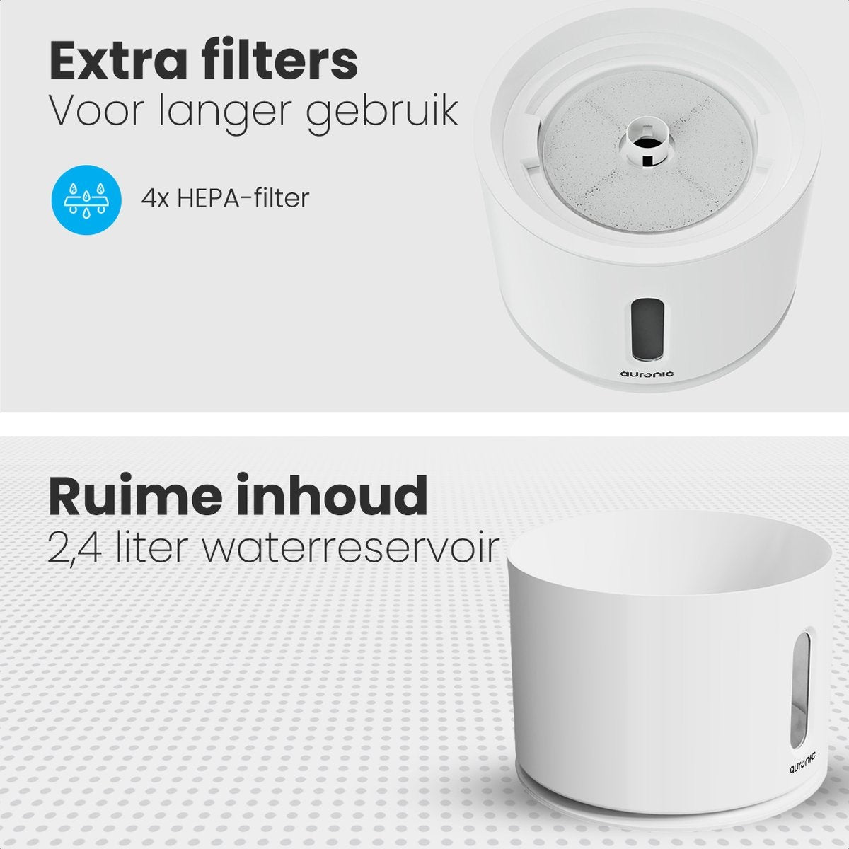 Auronic Trinkbrunnen - Wasserbrunnen für Katzen und Hunde - 2.4L - Tiertränke - Inkl. 4 Filter und 2 Bürsten - Weiß