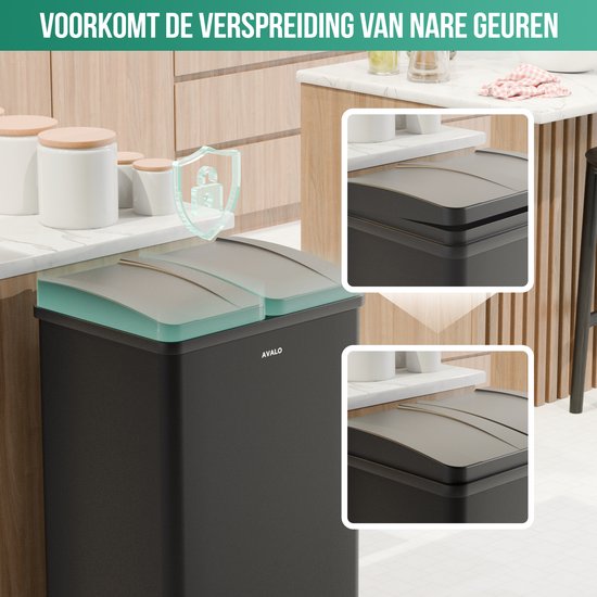 Der Avalo Mülleimer mit 2 Fächern ist für Ihren Komfort konzipiert. Dank des praktischen Pedalmechanismus und des Kunststoffdeckels öffnet und schließt er sich geräuschlos.