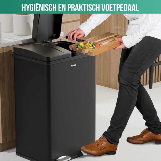 Avalo Mülleimer Abfalltrennung 60 Liter - Edelstahl Schwarz - 2 Fächer - Umweltbewusst, Hygienisch & Fingerabdruckfrei - Treteimer / Mülleimer