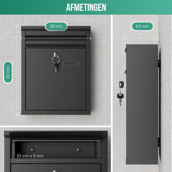Der stilvolle, kompakte und sichere Metallbriefkasten von Avalo ist genau das, was Sie suchen. Er bietet nicht nur eine schicke Optik für Ihre Wand, sondern ist auch wetterfest und einfach zu montieren. Frischen Sie Ihren Eingangsbereich mit diesem hochwertigen Briefkasten in den Maßen 32x25x8,5 CM auf und erleben Sie die Kombination aus Funktionalität und Design.