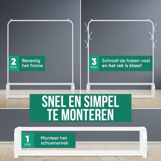 Dieser weiße Metall-Kleiderständer mit Schuhablage und Haken ist einfach zu montieren. Befolgen Sie die Anweisungen und verwenden Sie das mitgelieferte Werkzeug, um den weißen Kleiderständer zu montieren. Der Metall-Kleiderständer ist auch leicht mit einem weichen, feuchten Tuch zu reinigen.
