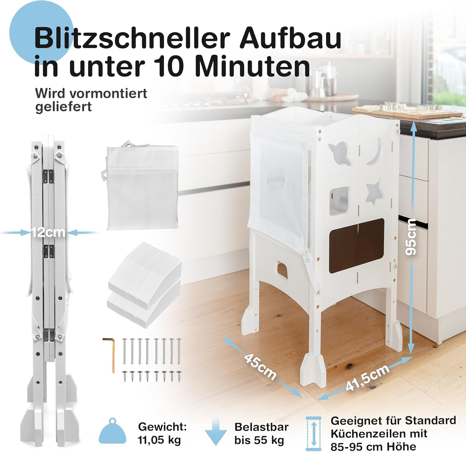 - Schnell aufgebaut – Der BabybeFun Lernturm ist zu 90% vormontiert. Er ist in nur 10 Minuten einsatzbereit und ermöglicht es Ihnen und Ihrem Kind, die Küche sofort zu erobern.