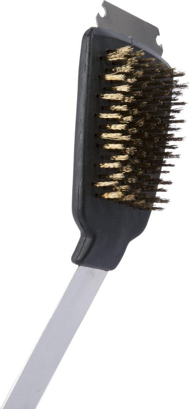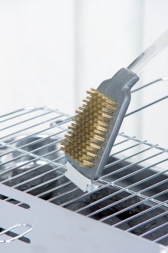 Verkrustetes Fett, Essensreste und angebrannte Stücke; all das wird mit diesem Werkzeug mühelos entfernt. An einem Ende des 45 Zentimeter langen Griffs befindet sich eine robuste Bürste mit Stahlborsten. Damit können Sie Grillroste oder -platten gründlich reinigen. Der superstarke Stahlschaber am oberen Ende der Bürste hilft Ihnen, hartnäckigen und festsitzenden Schmutz zu entfernen.