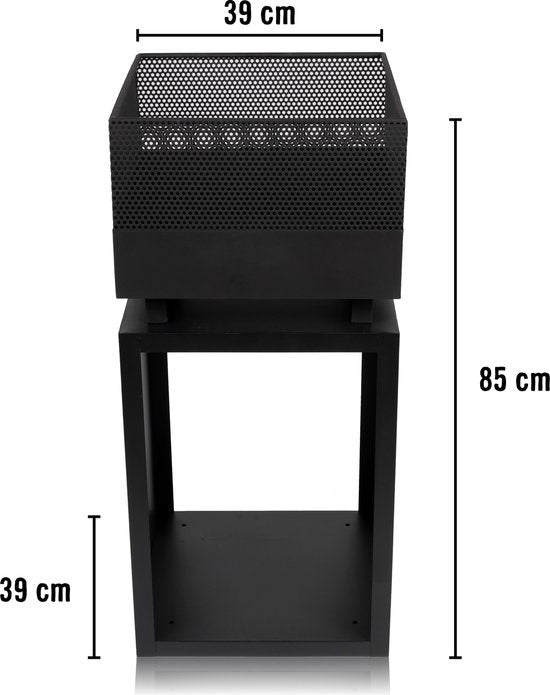 BBQ Collection - Feuerkorb mit Funkenschutz - Gartenkamin 39 x 39 x 85 cm - Outdoor-Kamin mit Pfahl und Brennholzlager - Holzofen für Garten und Terrasse - Outdoor-Ofen für Holz - Carbonstahl