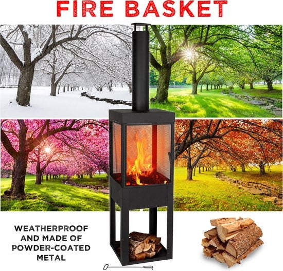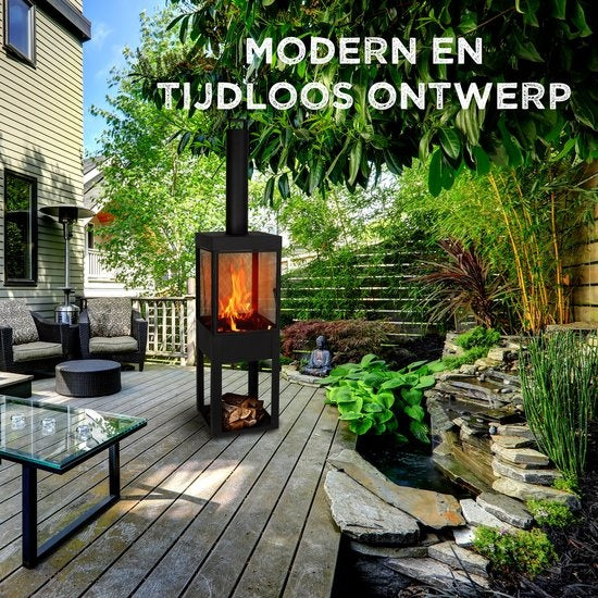 Dieser moderne Außenkamin wird natürlich mit Brennholz betrieben. Das bedeutet, dass Sie ständig Holz nachlegen müssen, um den Terrassenofen genießen zu können. Glücklicherweise müssen Sie dafür nicht weit laufen. Der Holzofen verfügt nämlich über einen praktischen Stauraum, in dem Sie mehrere Brennholzstücke lagern können. Mit dem praktischen mitgelieferten Schürhaken können Sie das ältere Holz leicht anfachen, um dann neues Holz ins Feuer zu legen.