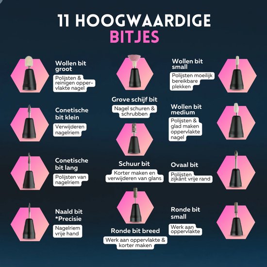 Mit dem umfassenden Set, bestehend aus 12 Mehrzweck-Bits, 4 Zubehörteilen (Glasnagelfeile, Nagelstaubpinsel, Bokkepoot und Nagelhautentferner) und 60 Schleifrollen, haben Sie allen Komfort, den Sie brauchen.Mit dem Dornaufsatz ist dieses Set ideal für verschiedene Arten von (Kunst-)Nägeln und hartnäckige Schwielen.
