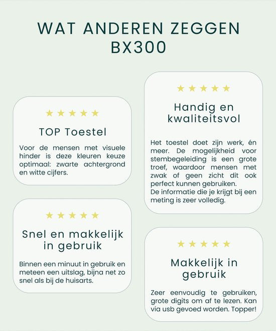✓ Batterien und Manschette im Lieferumfang enthalten ✓ Benutzerhandbuch in niederländischer Sprache ✓ Vorlesefunktion & großer Bildschirm ✓ 240 Speicherplätze (für 2 Benutzer) ✓ Erkennt unregelmäßige Herzschläge & falsch angelegte Manschette ✓ USBC-Buchse für Kabelanschluss ✓ Kundendienst 7 Tage die Woche verfügbar