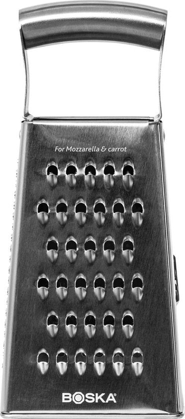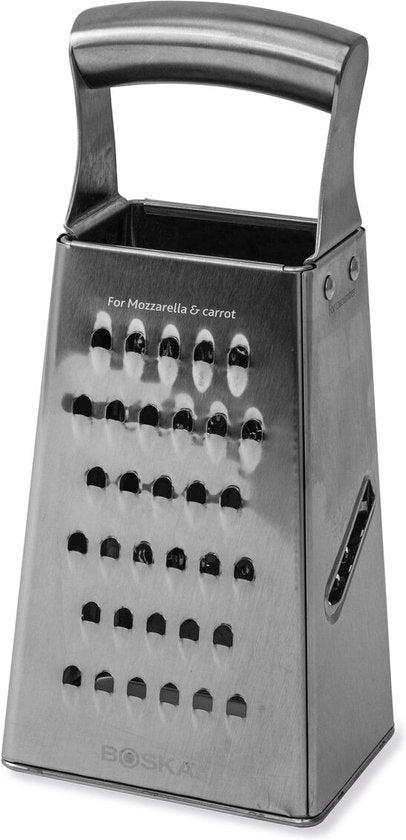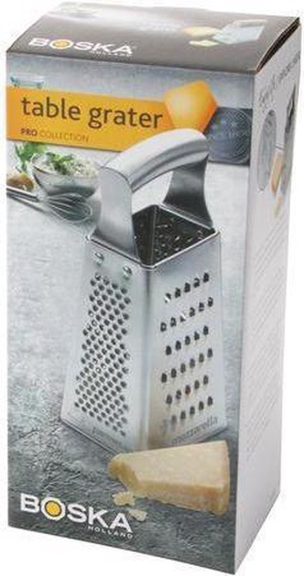 Mit der Tischreibe Monaco+ von BOSKA lassen sich die leckersten Käsesorten, Gemüse und Schokolade ganz einfach reiben. Legen Sie die handliche Edelstahlreibe auf den Tisch und schieben Sie die Lebensmittel darüber. Perfekt für echte Feinschmecker! Die vier Oberflächen dieser Tischreibe zeigen Ihnen deutlich, wie Sie jede Art von Reibe am besten verwenden können. So können Sie mit Leichtigkeit Käse in Pulver, kleine Stücke oder kräftige Flocken reiben. Dieser Topper sorgt dafür, dass Ihre Gerichte optimal abgeschmeckt werden. Genießen Sie Ihr Essen!