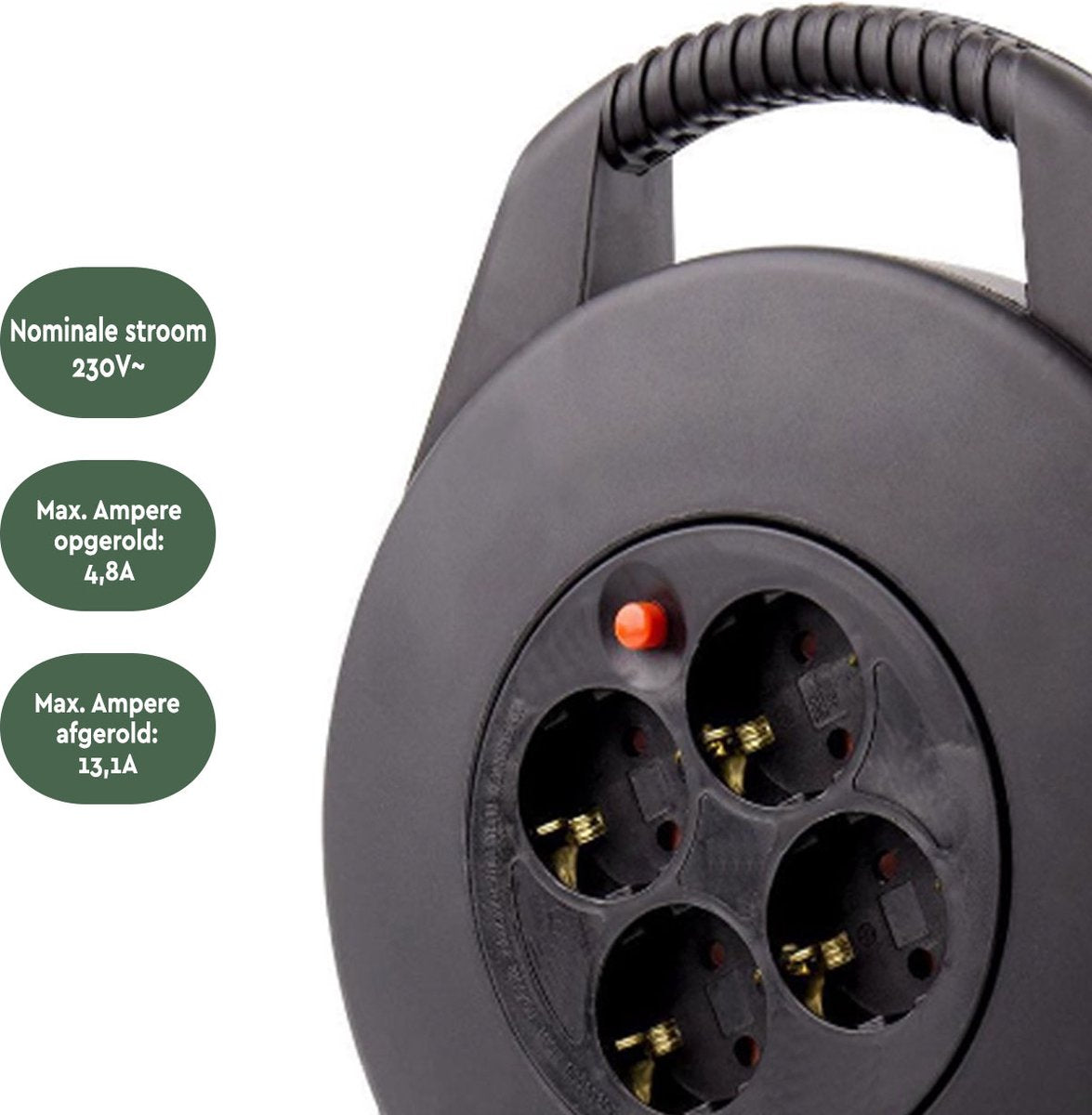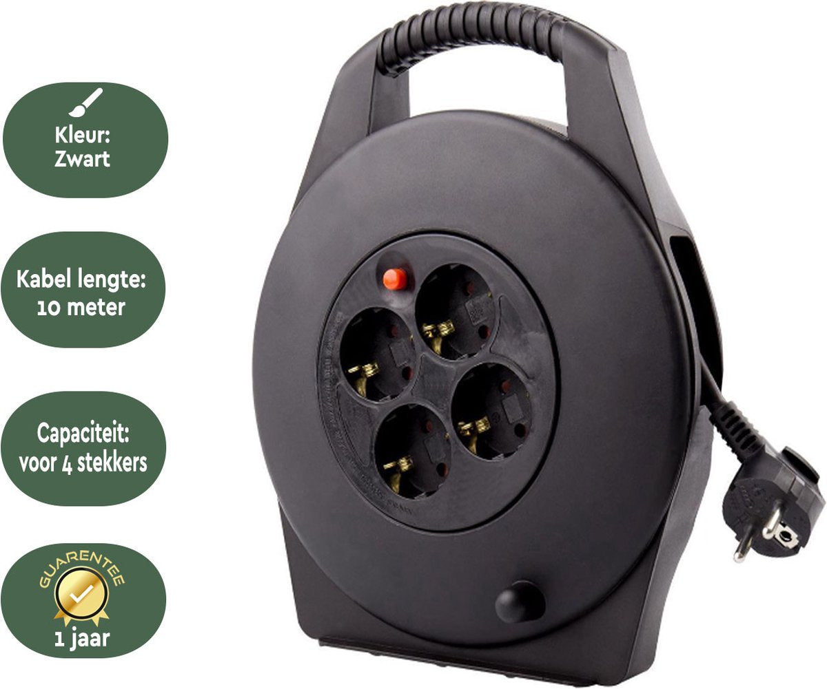 BRASQ Kabeltrommel - 4-fach - Schwarz - 10 Meter - Trommelverlängerungskabel - Verlängerungskabel - Mit Erdung - Für den Innenbereich