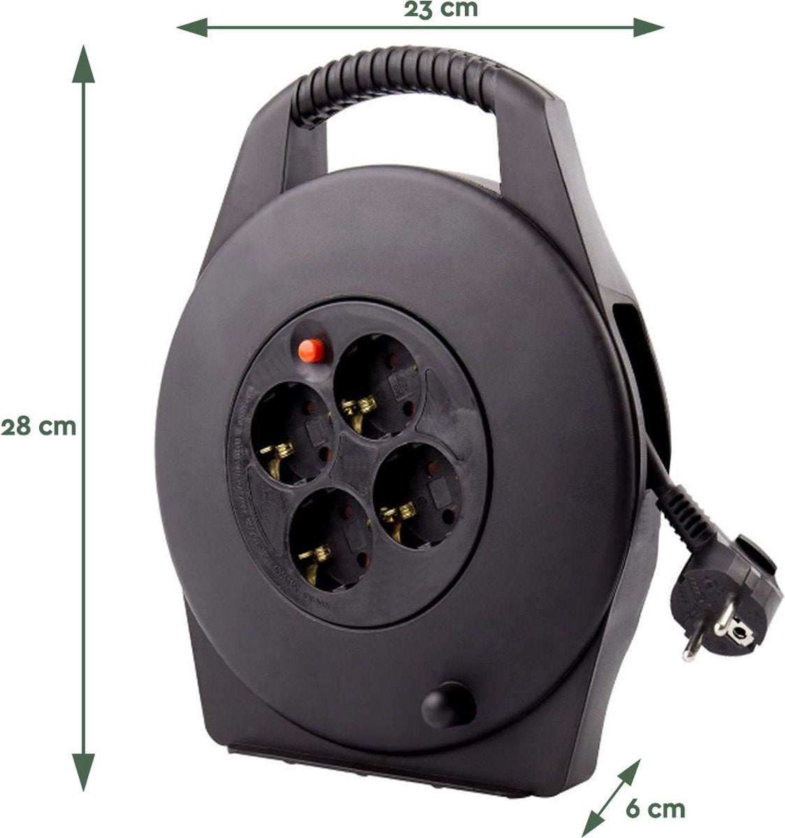 4 geerdete Steckdosen: Die Kabeltrommel verfügt über vier geerdete Steckdosen, an die Sie problemlos mehrere Geräte anschließen können. Die 3-poligen, geerdeten Steckdosen bieten zusätzliche Sicherheit und Zuverlässigkeit, auch beim Anschluss schwererer Geräte.