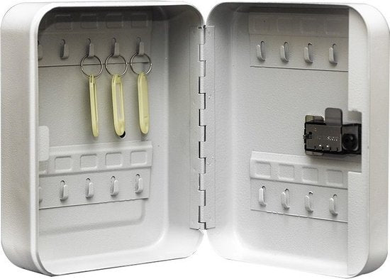 Der Schlüsseltresor ist aus Metall gefertigt, was eine sichere und hochwertige Aufbewahrung Ihrer Schlüssel gewährleistet. Er wird in einem hellgrauen Farbton angeboten. Sie können das Schließfach mit dem Codeschloss abschließen, was den Vorteil hat, dass mehrere Personen Zugang zu den benötigten Schlüsseln haben können, ohne dass zusätzliche Schlüssel im Umlauf sind.