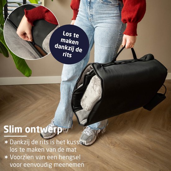 Dank des Reißverschlusses ist es möglich, das Kissen von der Matte zu lösen. Das hat den Vorteil, dass Sie das Kissen auch für andere Zwecke nutzen können, zum Beispiel für Ihre Füße. Außerdem kann die gesamte Matratze zusammengerollt und mit einem Reißverschluss verschlossen werden, um sie kompakt zu verstauen. Ein Griff sorgt dafür, dass Sie die Massagematratze einfach mitnehmen können.