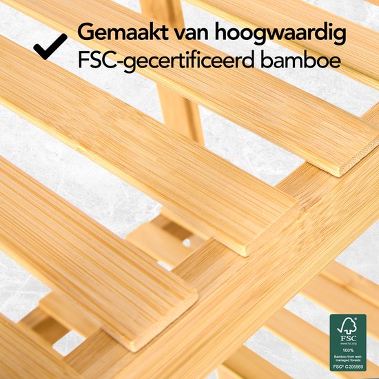Die Verwendung von lackiertem Bambusholz macht dieses Regal nicht nur zu einer umweltfreundlichen Wahl, sondern auch zu einer klugen Investition. Bambus ist eines der stärksten Hölzer, was es sehr robust und strapazierfähig macht. Außerdem ist es feuchtigkeitsresistent, pflegeleicht und verrottungsfrei, was es ideal für Feuchträume wie das Badezimmer macht.