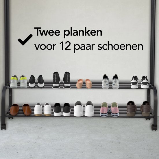 Brixy Kleiderständer - Kleiderständer doppelt - Garderobenständer auf Rädern - Kleiderständer mit Schuhregal - 98 x 34 x 159 cm - Schwarz