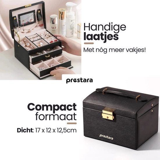 - Drei Ebenen: Die Box verfügt über drei Ebenen, von denen zwei Schubladen sind. Diese Struktur bietet reichlich Platz für verschiedene Arten von Schmuck, von Halsketten bis zu Ohrringen.