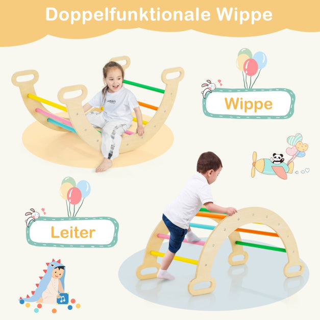 Klettergerüst-Set 4-in-1 aus Holz: Montessori-Kletterdreieck mit Schaukelbogen und Rutsche (farbenfroh)
