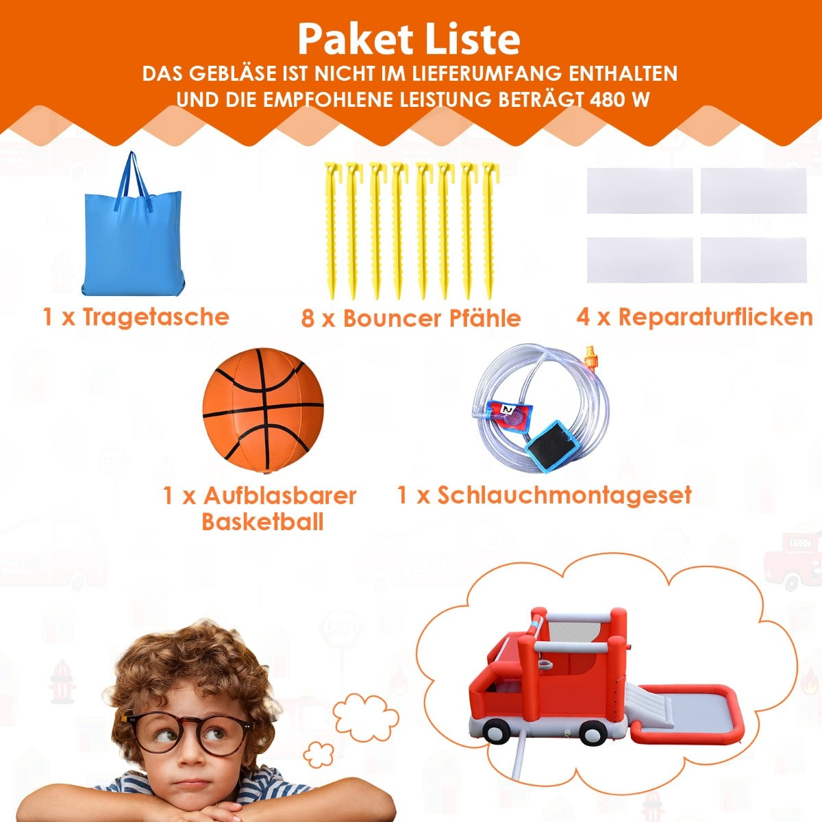Wichtiges Zubehör: Das Paket enthält verschiedene Zubehörteile, darunter eine entleerte Wasserrutsche, eine Tragetasche, 8 Befestigungspfähle, 4 Reparaturflicken, einen aufblasbaren Basketball und ein Schlauchmontageset. Da wir jedoch kein Gebläse liefern, sollten Sie selbst ein 480-W-Gebläse kaufen.