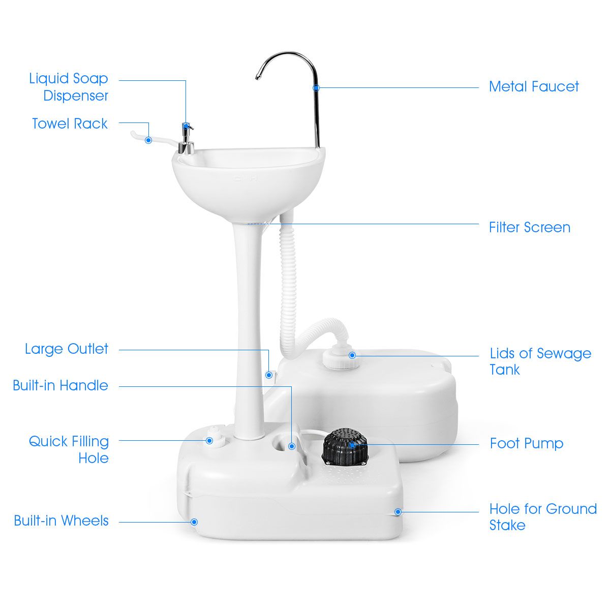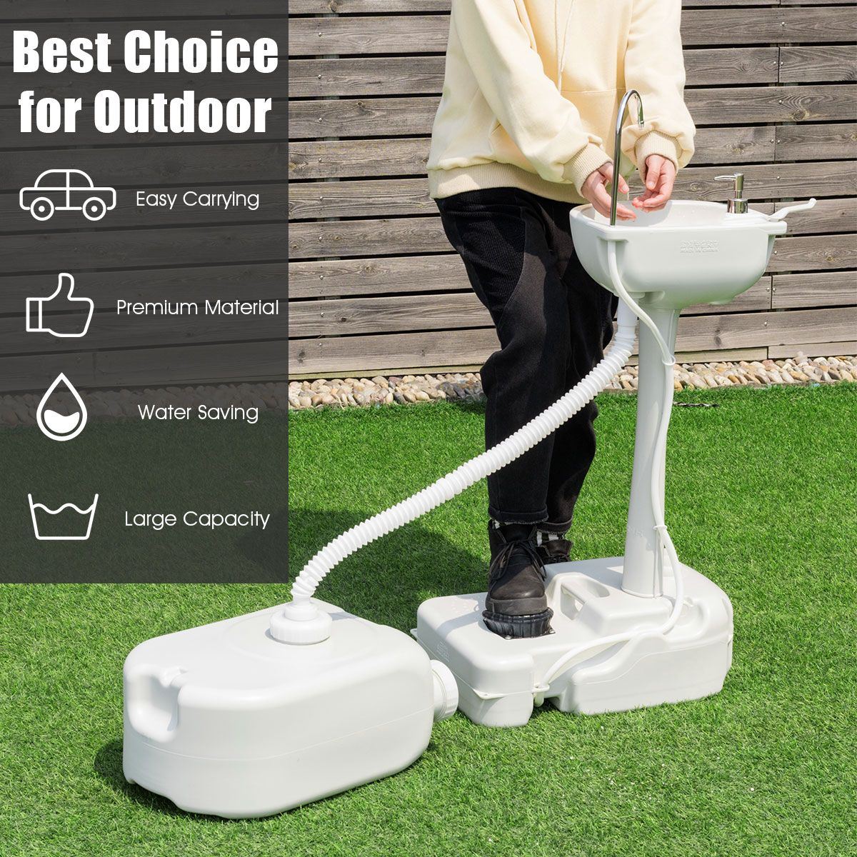 Ein Camping-Waschbecken, das perfekt für den Außenbereich ist! Die ungiftige, wasserdichte HDPE-Auskleidung hält auch den härtesten Elementen im Freien stand. Die dicken Räder und das geringe Gewicht von 5 kg machen den Transport einfach, während die Erdnägel für Stabilität sorgen. Die großzügige Wasserkapazität von 17 Litern und der 3-Liter-Flüssigseifenspender sorgen für einen ausreichenden Verbrauch, während die fußbetätigte Pumpe eine praktische Handhabung ermöglicht. Außerdem ist er mit einem Handtuchhalter und einer zusätzlichen Ablagefläche ausgestattet.