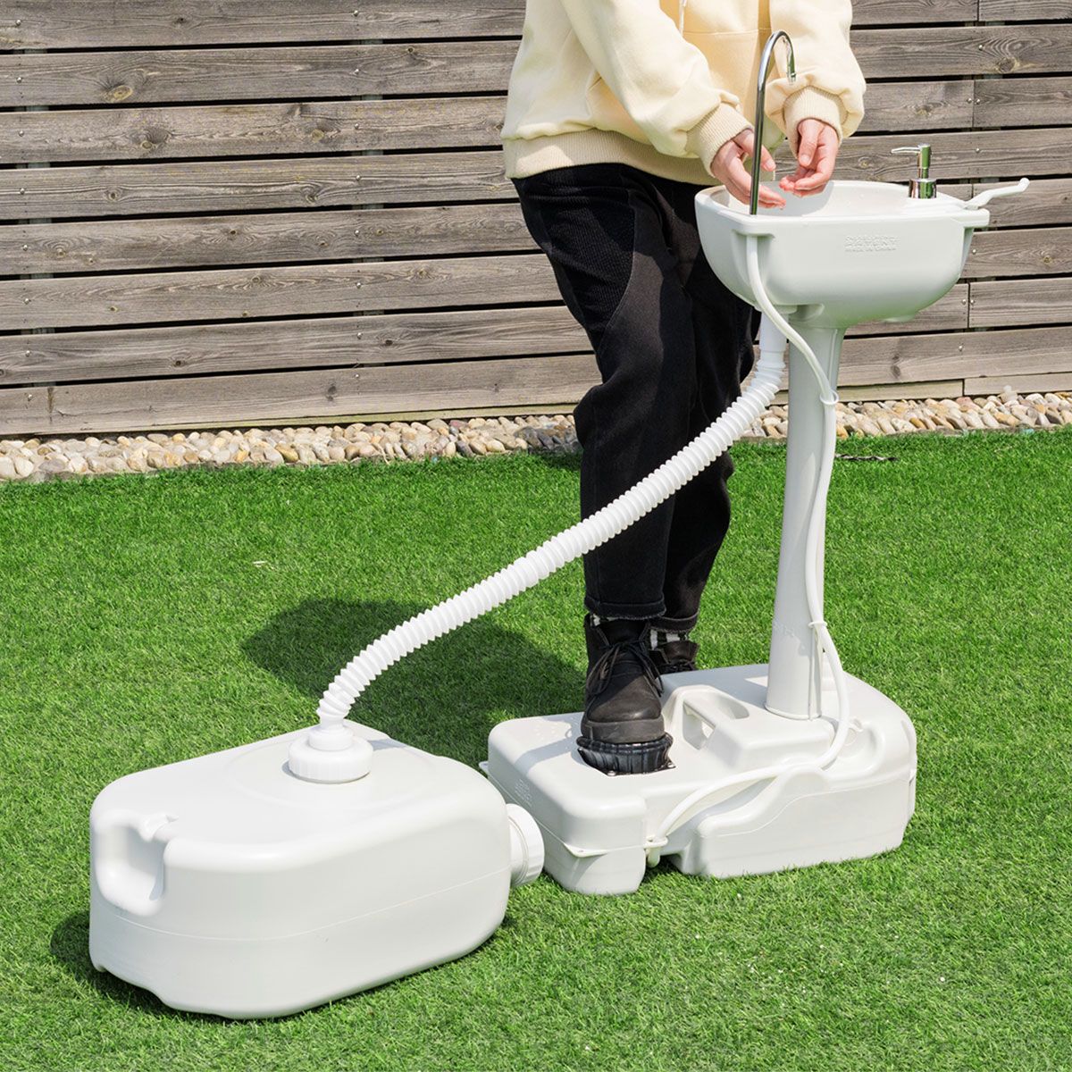 Viele Einsatzmöglichkeiten: Verwenden Sie das eigenständige Waschbecken, um unbelastet zu reisen; oder kombinieren Sie es mit dem Abwassertank, um Wasser zum Wohle der Natur zu recyceln; oder schließen Sie es an das Abflussrohr an, um Ihr eigenes temporäres Camping-Waschbecken zu bauen.