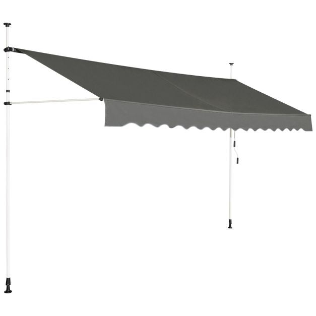 Gut gewählte Materialien...Mit einem robusten Aluminiumrahmen gebaut, ist unsere Außenmarkise haltbar genug, um eine lange Lebensdauer zu gewährleisten. Die einzelnen Komponenten sind fest miteinander verbunden, um eine stabile Struktur zu bilden, die einen starken Halt bietet, um einer gewissen Windstärke standzuhalten. Das hochwertige Oxford-Gewebe ist witterungsbeständig und widersteht dem Ausbleichen, Feuchtigkeit und Staub.