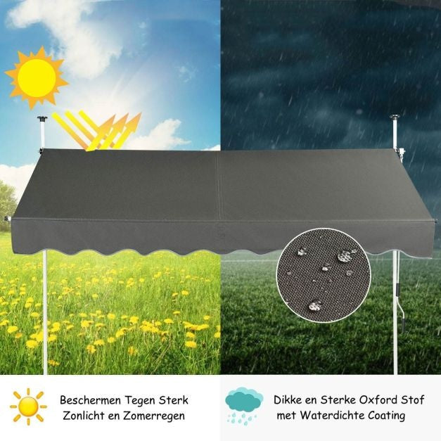 Diese einziehbare Markise ist ideal für den Einsatz vor dem Fenster, auf der Terrasse, dem Balkon oder in Ihrem Garten. Diese witterungsbeständige Markise ist aus ausgesuchtem Oxford-Gewebe mit PU-Beschichtung gefertigt. Und dank des leichten, aber robusten Aluminiumgestells hat dieses Sonnensegel eine stabile und robuste Struktur, die einer gewissen Windstärke standhält. Dank der Kurbel lässt sich das Sonnensegel zusammenklappen und in der Höhe und im Winkel verstellen. Dieses clevere Design kann grelle Blendung reduzieren und bietet Ihnen weicheres Licht und kühlere Temperaturen. Dieser Sonnenschirm ist die perfekte Wahl für Ihren Außenwohnbereich und lässt sich leicht manuell bedienen.