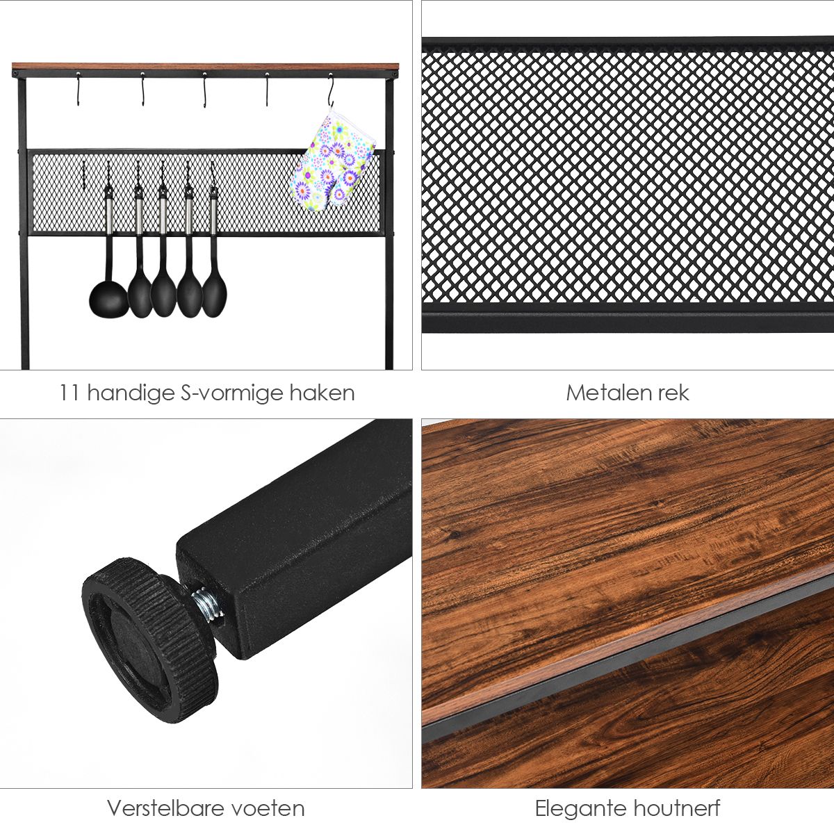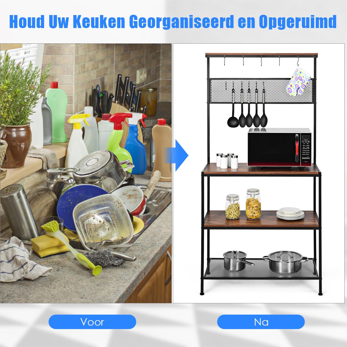 Aus dickerem Karton und Eisenrohr gefertigt, ist das Bäckereigestell robust und langlebig für eine lange Lebensdauer. Es tut auch hervorragend in rostfrei mit Farbe Beschichtung auf sie. Die verstellbaren Beine sorgen für große Stabilität. Das 4-stufige Design, einschließlich 3 Holzböden und 1 Gitterebene, bietet reichlich Stauraum und klassifizierten Platz, so dass Ihr Zuhause ordentlich und aufgeräumt ist. Außerdem helfen 11 S-Haken, Gegenstände wie Pfannen und Kellen einfach und mühelos aufzuhängen!