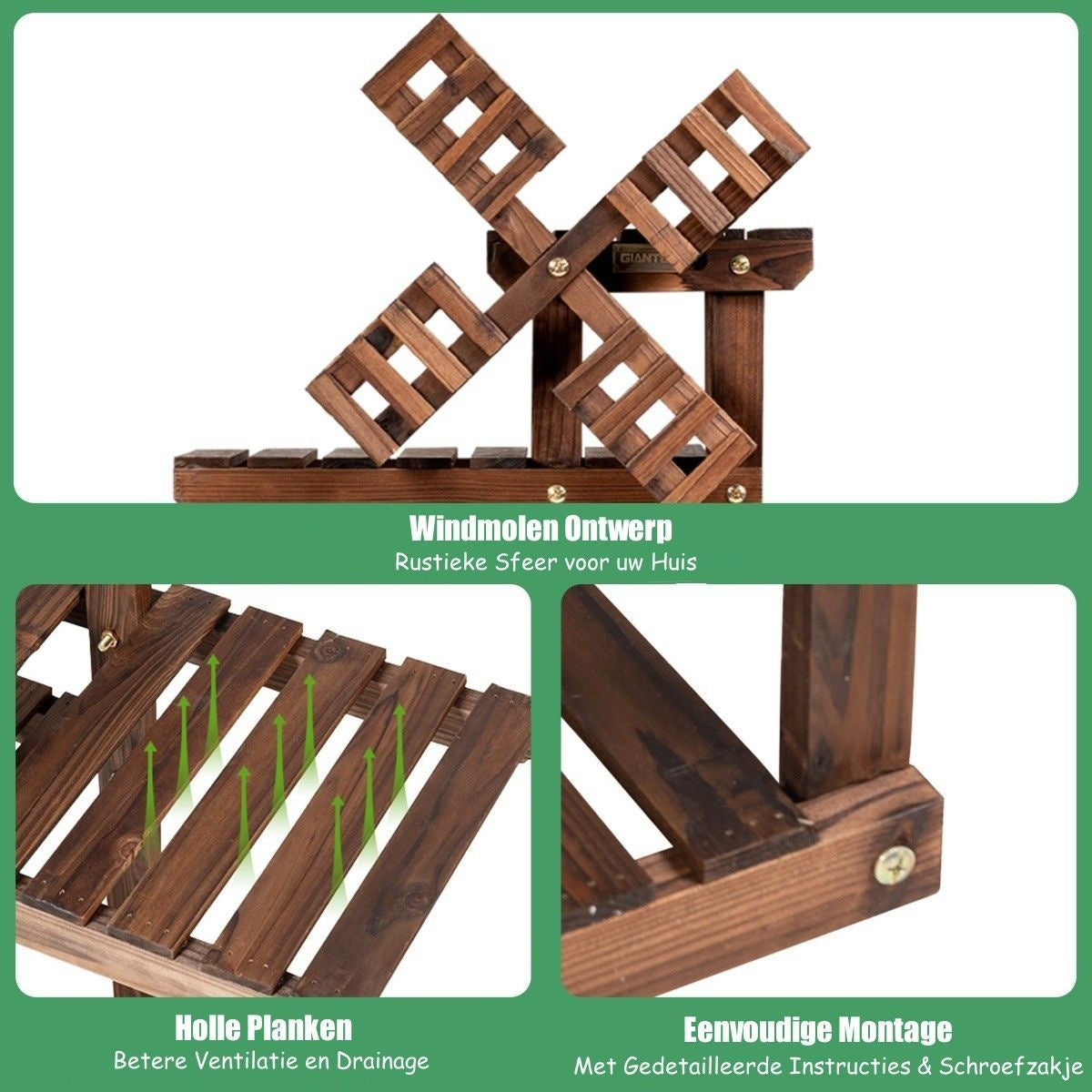 Unser multifunktionales Regal kann nicht nur für Pflanzen, sondern auch für Bücher, Dekoration und andere Dinge auf dem Balkon, der Terrasse, dem Garten oder im Wohnzimmer verwendet werden. Durch den starken Holzrahmen und die Metallschrauben ist die gesamte Konstruktion stabil und zuverlässig. Auf dem Regal können Pflanzen in verschiedenen Größen verwendet werden. Verwandeln Sie Ihren Garten mit diesem Regal in ein buntes Blumenparadies! Attribute: rustikale Windmühlenform: Das Regal in Form einer rustikalen Windmühle ist äußerst dekorativ und kann für alle Arten von Gegenständen wie Dekoration oder Bücher im Wohnzimmer, Schlafzimmer, Garten, auf dem Balkon, der Terrasse usw. verwendet werden. Verschiedene Blumenregale nehmen wenig Platz ein und lassen sich gut in Ecken unterbringen. Mit Einlegeböden in 5 Ebenen wird Platz für bis zu 5 ~ 9 Topfpflanzen verschiedener Arten und Größen geboten. Die bewegliche Anordnung sorgt zudem für optimale Wachstumsbedingungen. Starke und langlebige Konstruktion: Die Holzteile sind durch hochwertige Schrauben fest miteinander verbunden und der Rahmen ist durch seine Langlebigkeit und Belastbarkeit von 10 kg pro Ebene garantiert. Das Gewicht wird durch die große Kontaktfläche mit dem Boden sicher verteilt. Shable Fir Wood: Dieses Pflanzenregal ist aus natürlichem Tannenholz gefertigt und sehr stabil. Durch die Hochtemperaturverkohlung ist es gegen Verformung, Korrosion und Insektenbefall geschützt. Es wertet Ihren Außenbereich optisch auf und verleiht ihm eine natürliche Frische. Schönes Design: Mit seiner glatten Oberfläche und den abgerundeten Ecken kann das Regal sicher genutzt werden. Das offene Design ermöglicht die Entwässerung und Luftzirkulation und bietet so optimale Wachstumsbedingungen für Pflanzen. Merkmale: Rustikales Windmühlendesign - Polierte, rillenfreie Oberfläche für die sichere Verwendung von Topfpflanzen - Offene Konstruktion. Reinigung mit mildem Reinigungsmittel und feuchtem Tuch