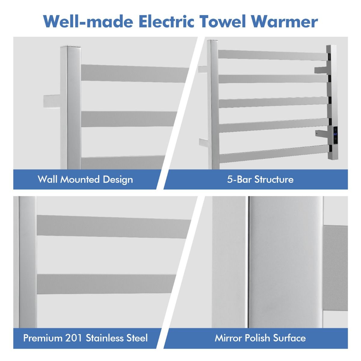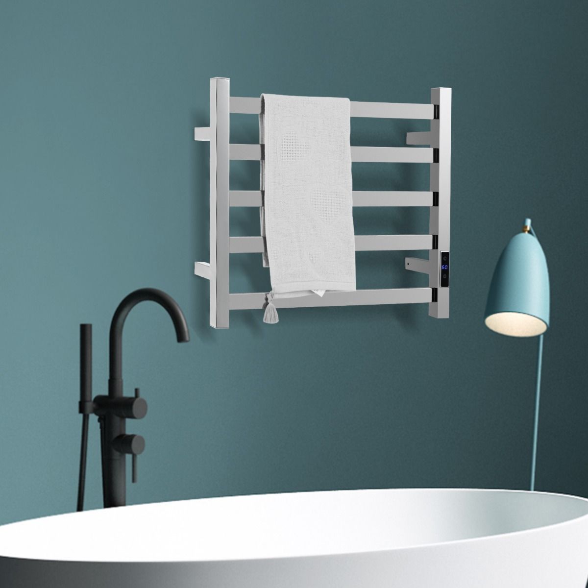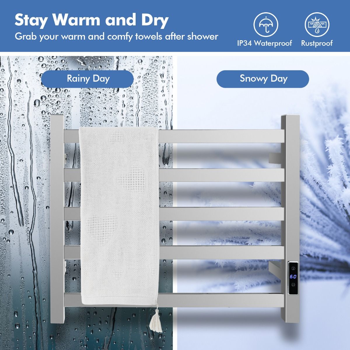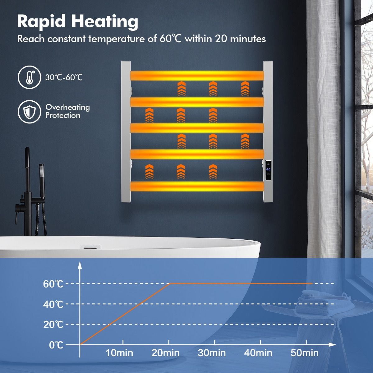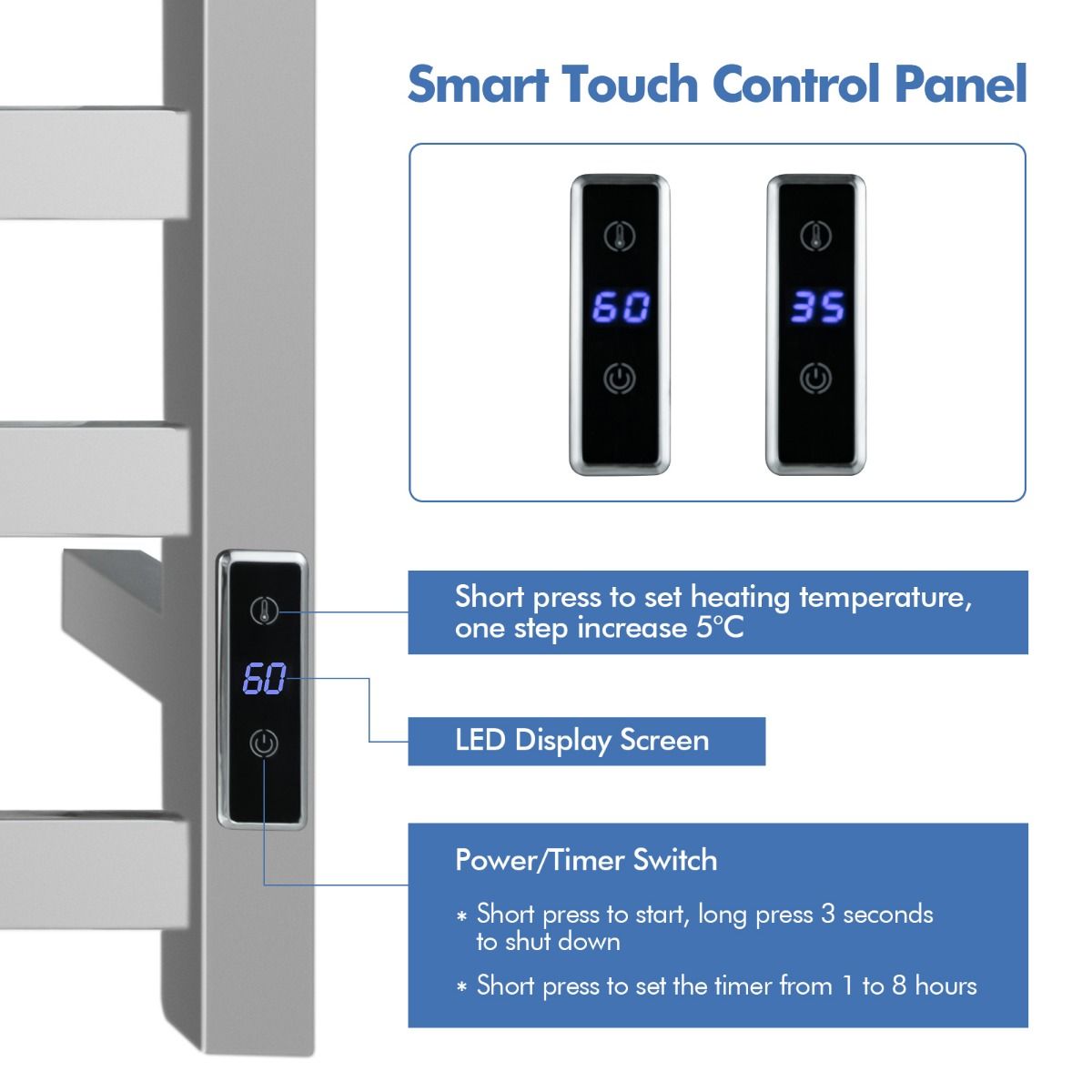 Dank seiner fortschrittlichen Heiztechnologie heizt dieser elektrische Handtuchhalter schnell auf und erreicht die konstante Heiztemperatur von 60°C in 20 Minuten. Außerdem kann die Höchsttemperatur von 30°C bis 60°C eingestellt werden. Der eingebaute Timer von 1 bis 8 Stunden, die einstellbare Temperatur und die übersichtliche LED-Anzeige garantieren eine einfache Bedienung. Darüber hinaus verhindert der Überhitzungsschutz jede potenzielle Gefahr. Dieser wandmontierte Handtuchhalter ist einfach zu installieren und für jeden Raum geeignet.
