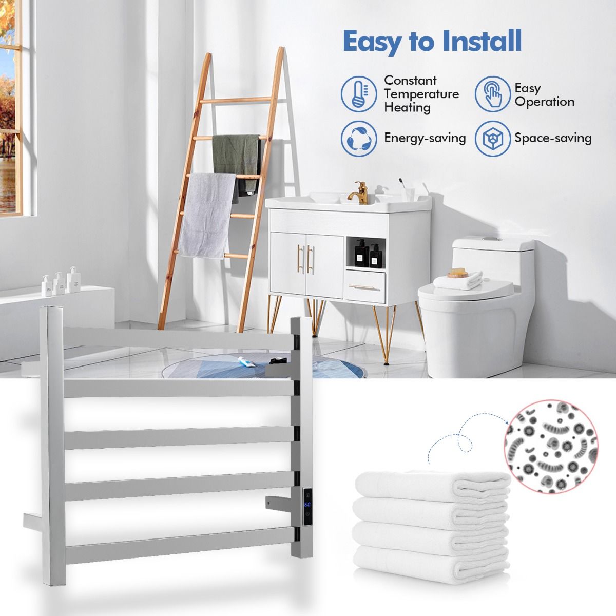 Schnelles Aufheizen und energieeffizient: Dieser elektrische Handtuchwärmer heizt sich nach dem Einschalten schnell auf und erreicht innerhalb von 20 Minuten eine konstante Spitzentemperatur von 60 °C (abhängig von der Raumtemperatur). Die Konstanttemperatur-Heizfunktion spart zudem viel Energie und erhöht die Heizeffizienz.