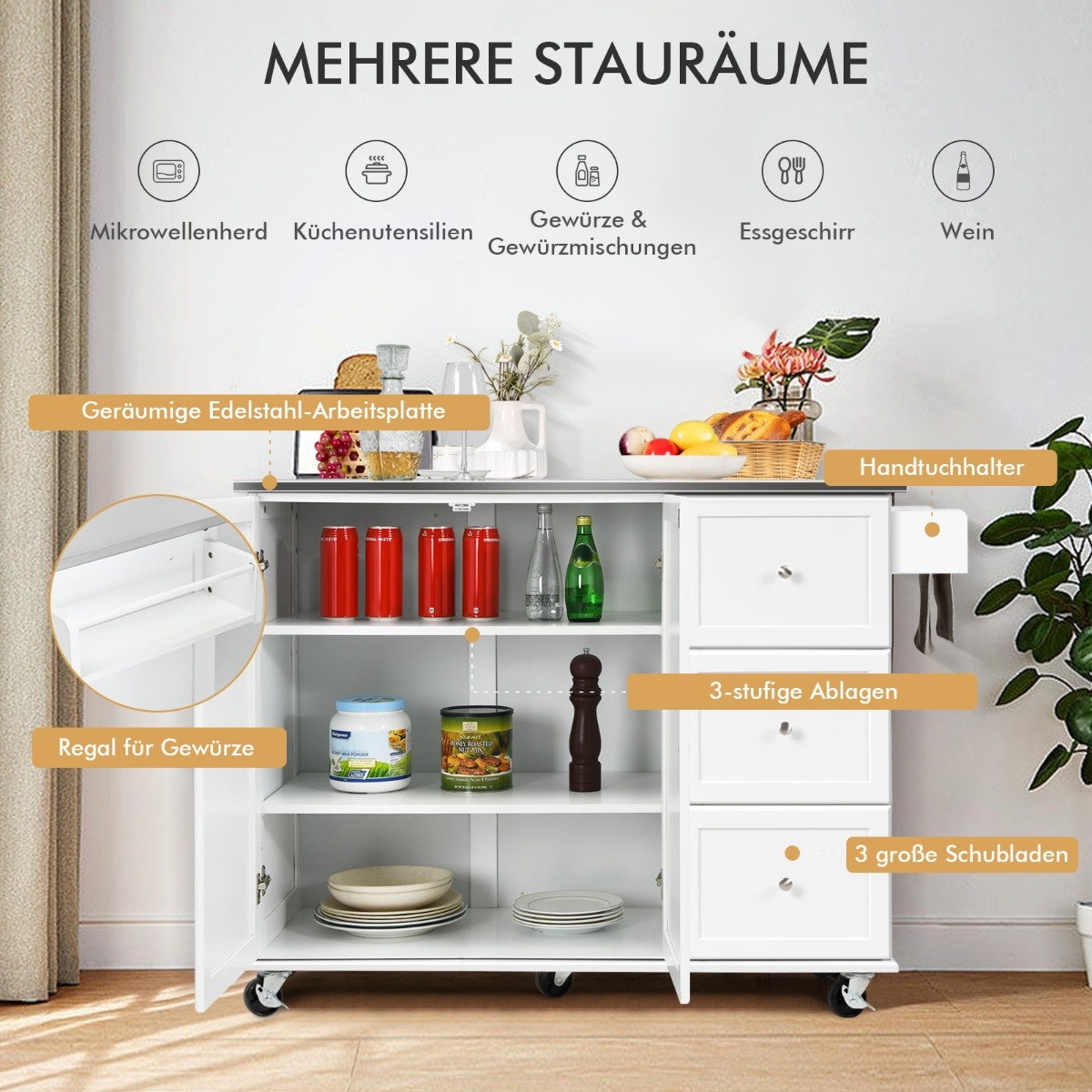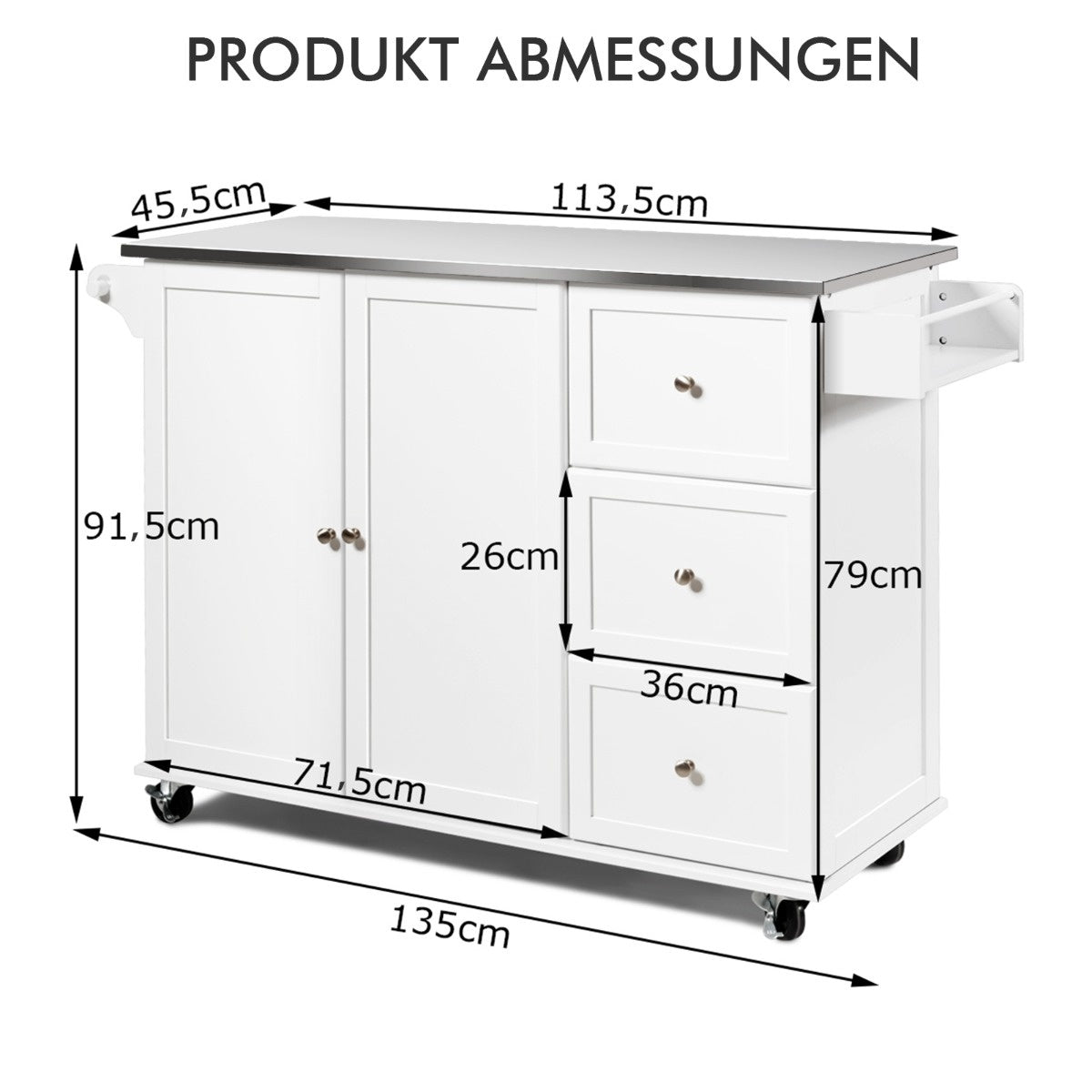 Coast mobiele keukenauto met roestvrijstalen werkblad en 3 laden en verstelbare planken wit