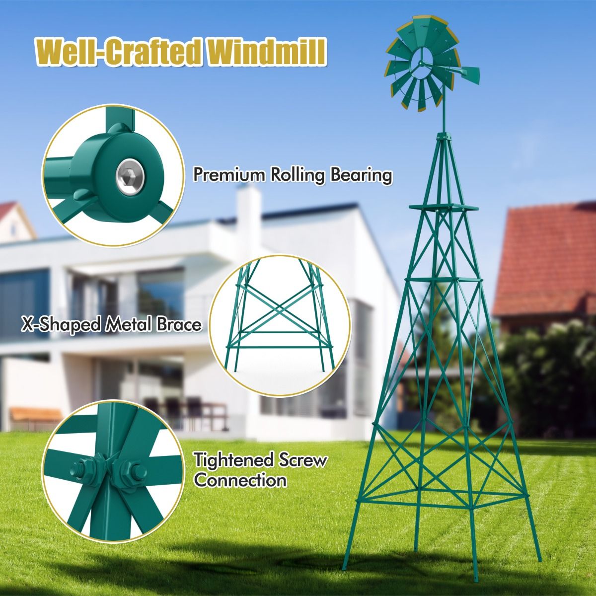 Verleihen Sie Ihrem Außenbereich einen rustikalen und stilvollen Look mit dieser beeindruckenden Costway Metallwindmühle mit einer Höhe von 253 cm. Die Windmühle kombiniert klassisches Design mit langlebigen Materialien und funktionellem Charakter, wodurch sie sowohl dekorativ als auch praktisch ist. Perfekt für Gärten, Höfe und Farmen, wo sie sich mit ihrer eleganten grünen Farbe harmonisch in die natürliche Umgebung einfügt.