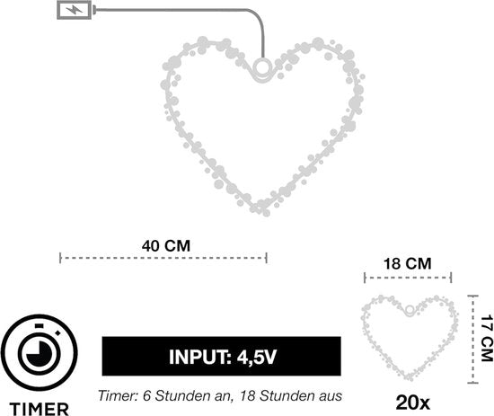 Geben Sie Ihrem Zuhause einen warmen und stimmungsvollen Touch mit den CozyHome herzförmigen Lichtern! Dieses Set besteht aus 20 niedlichen herzförmigen LED-Leuchten, die ein sanftes weißes Licht ausstrahlen. Dank des batteriebetriebenen Designs lassen sie sich überall aufstellen, ohne dass man eine Steckdose braucht. Perfekt für romantische Dekorationen, Partys, Hochzeiten oder einfach nur für ein gemütliches Ambiente in Ihrem Wohnzimmer, Schlafzimmer oder Garten.