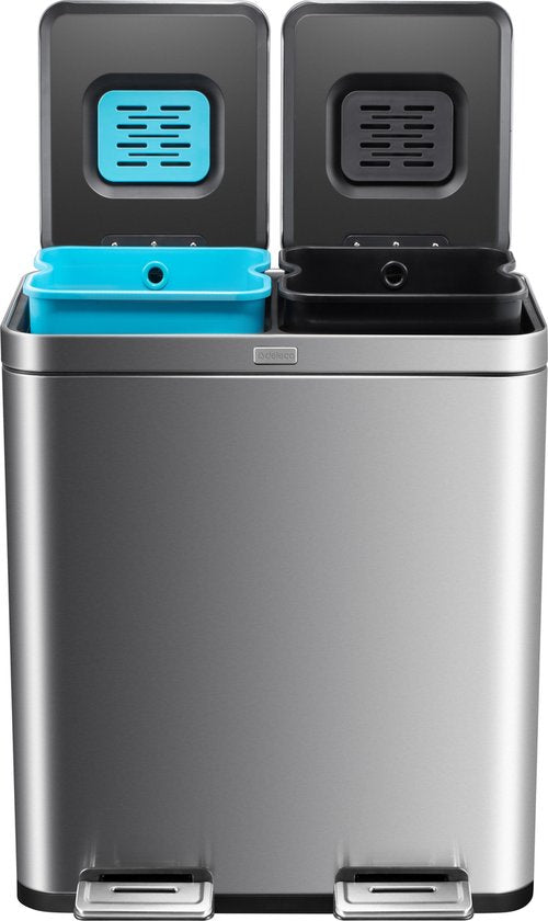 Deleca Recycling-Mülleimer mit 2 Fächern - 60 Liter (2x30) Abfallbehälter - Mülltrennung / Pfandbehälter / Tret-Abfallsammler - Mülleimer mit FreshAura Geruchskontrolle - Slow Close - Edelstahl Silber