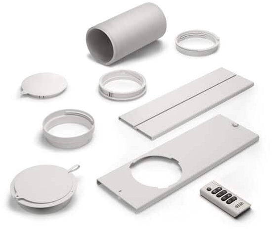Weißes mobiles Klimagerät in Einzelausführung zum Kühlen, Entfeuchten und Belüften. Energie-Effizienzklasse (Kühlen): A.