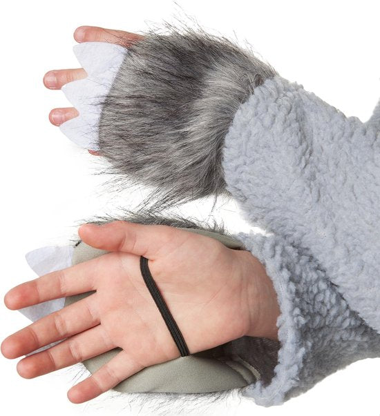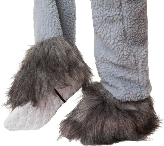 Das Unisex-Wolfskostüm besteht aus einem Overall und einer Kapuze. Der Overall ist aus einem hellgrauen, flauschigen und warmen Stoff gefertigt. Dank des langen Reißverschlusses auf der Rückseite kann man das Kostüm leicht an- und ausziehen. Am unteren Ende des Rückens befindet sich ein Wolfsschwanz aus grauem Kunstfell. Das Kostüm ist außerdem mit einem Stück grauen Kunstfells am Kragen verziert. Das gleiche Material findet sich auch an den vier Pfoten, die mit einem Gummiband an den Händen und Füßen befestigt sind. Die mitgelieferte Wolfsmütze mit Ohren besteht aus Kunstfell mit Stoffinnenfutter und wird unter dem Kinn mit einem Klettverschluss geschlossen, Material: 100 % Polyester.